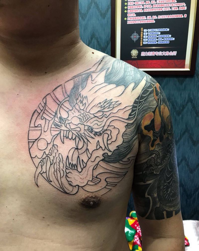 当前位置: 首页 >山东省烟台市纹身店-鼎力刺青专业纹身会所纹身图案>过肩龙龙头纹身图片