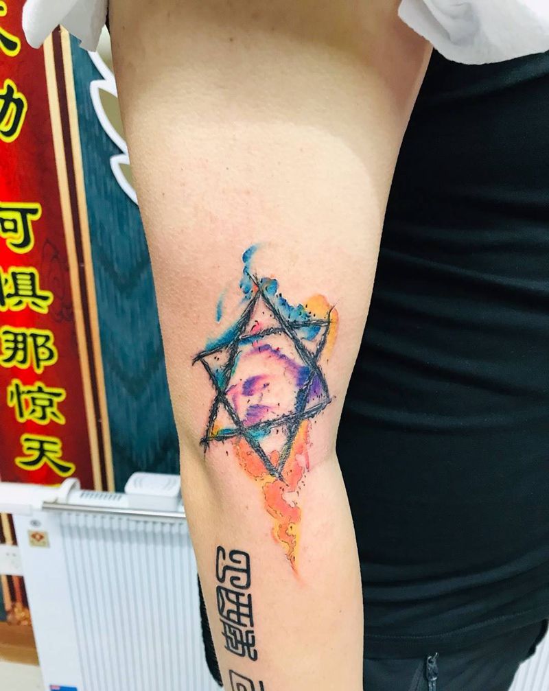 当前位置: 首页 >山东省烟台市纹身店-鼎力刺青专业纹身会所纹身图案>手臂水墨六芒星