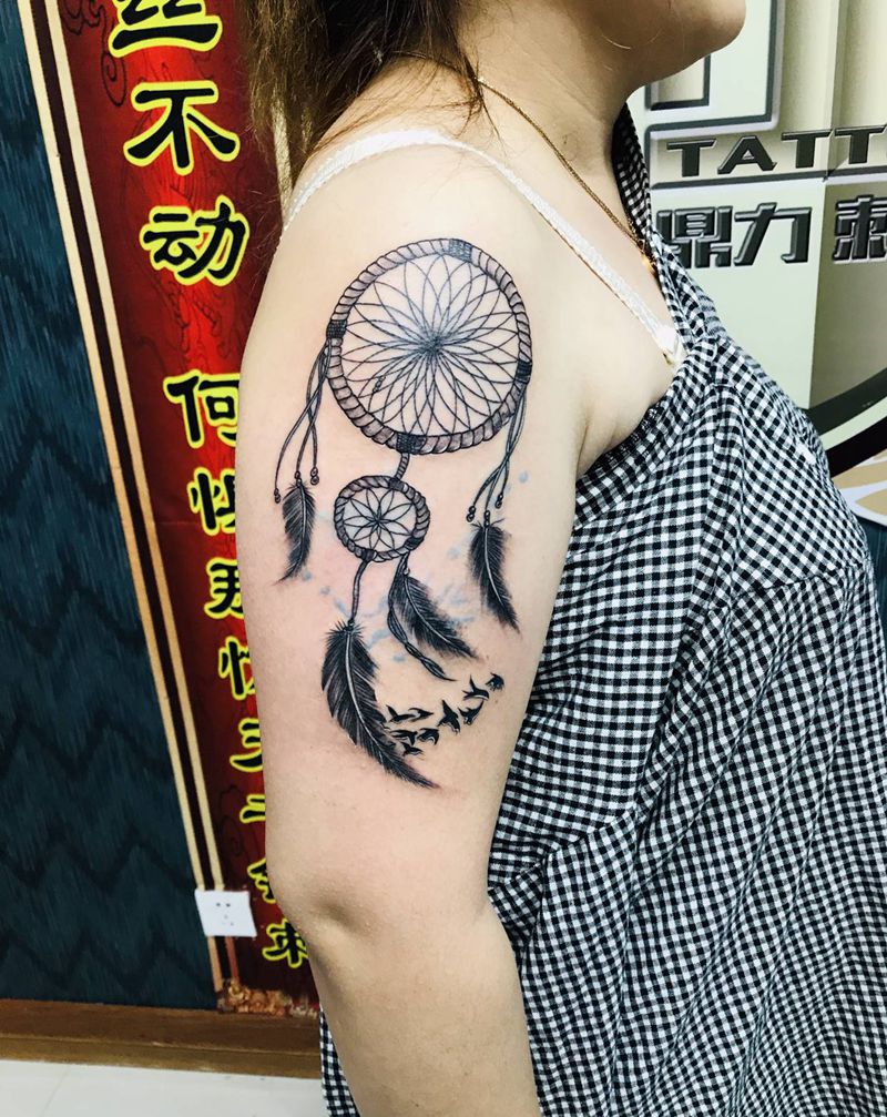 当前位置: 首页 >山东省烟台市纹身店-鼎力刺青专业纹身会所纹身图案>DL 大臂捕梦网纹身图片_手臂老传统纹身图案