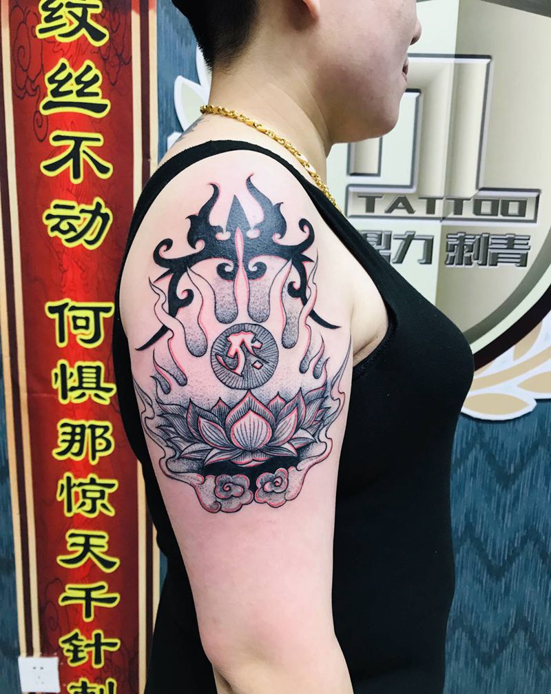 当前位置: 首页 >山东省烟台市纹身店-鼎力刺青专业纹身会所纹身图案>DL 大臂梵花图腾纹身图片_手臂点刺纹身图案