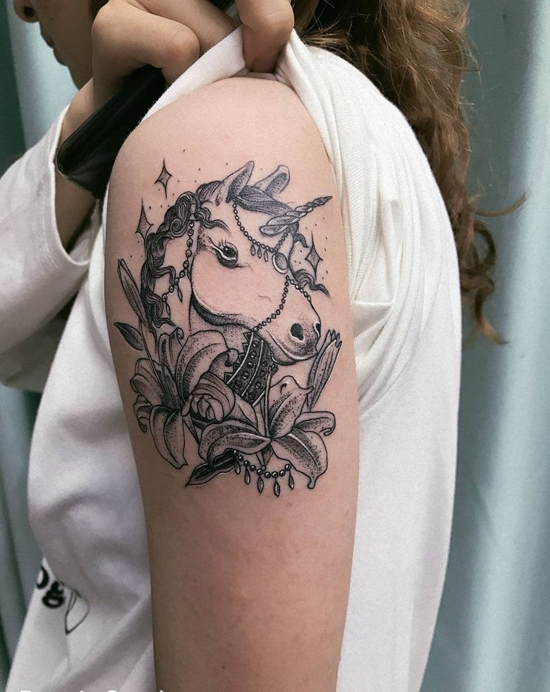 DL 美女大臂独角兽纹身图片_手臂Old School纹身图案