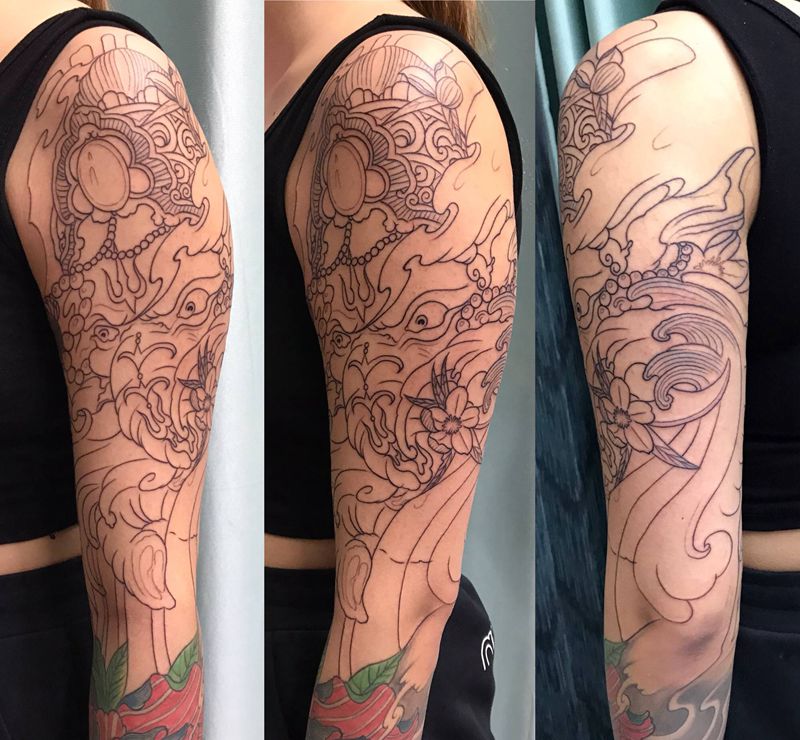 当前位置: 首页 >山东省烟台市纹身店-鼎力刺青专业纹身会所纹身图案>DL 接花臂线条纹身图片_手臂老传统纹身图案