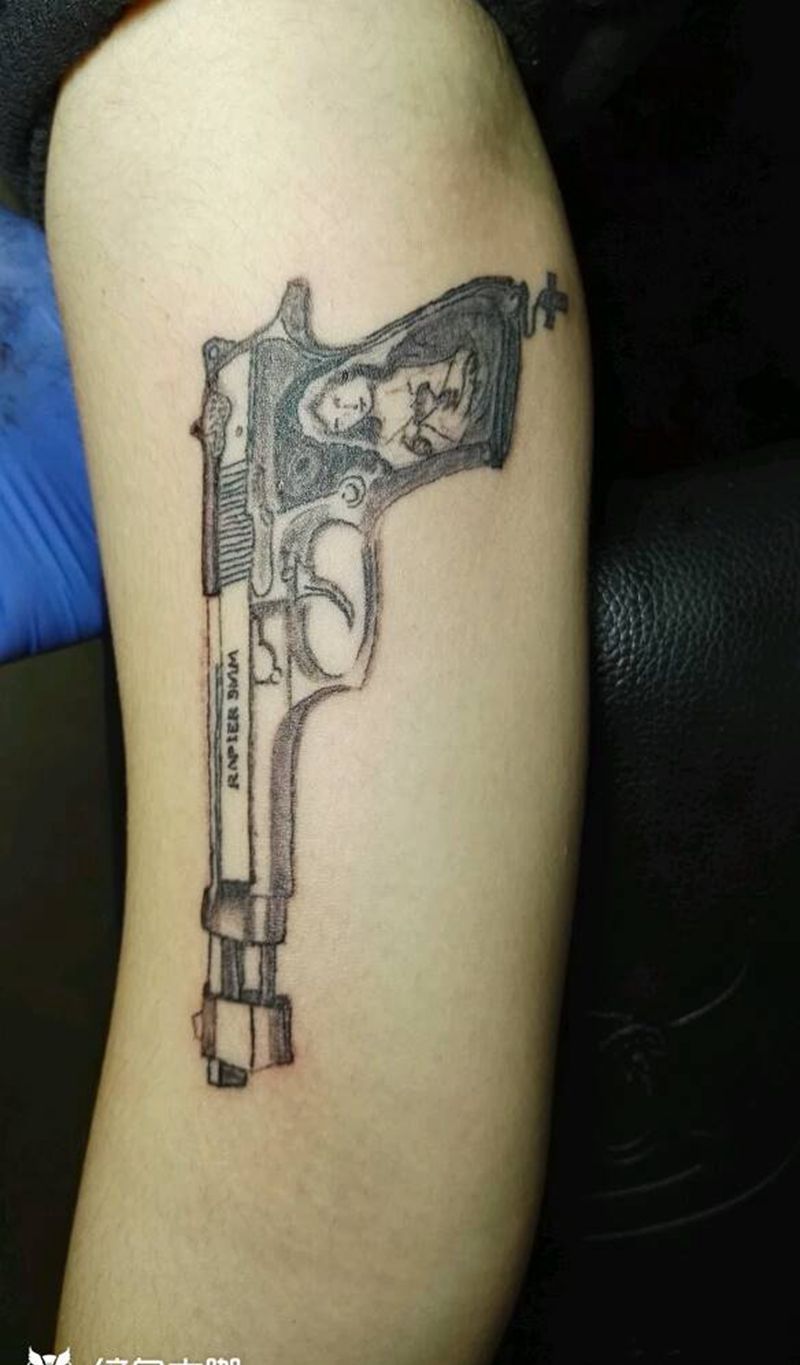 当前位置: 首页 >山东省东营市纹身店-铭源刺青·纹绣 TATTOO纹身图案>上臂手枪纹身图片_手臂欧美几何静物成品纹身图案