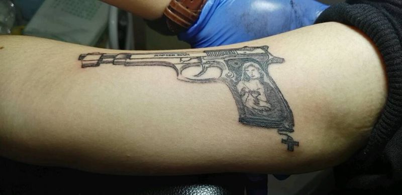 当前位置: 首页 >山东省东营市纹身店-铭源刺青·纹绣 TATTOO纹身图案>上臂手枪纹身图片_手臂欧美几何静物成品纹身图案