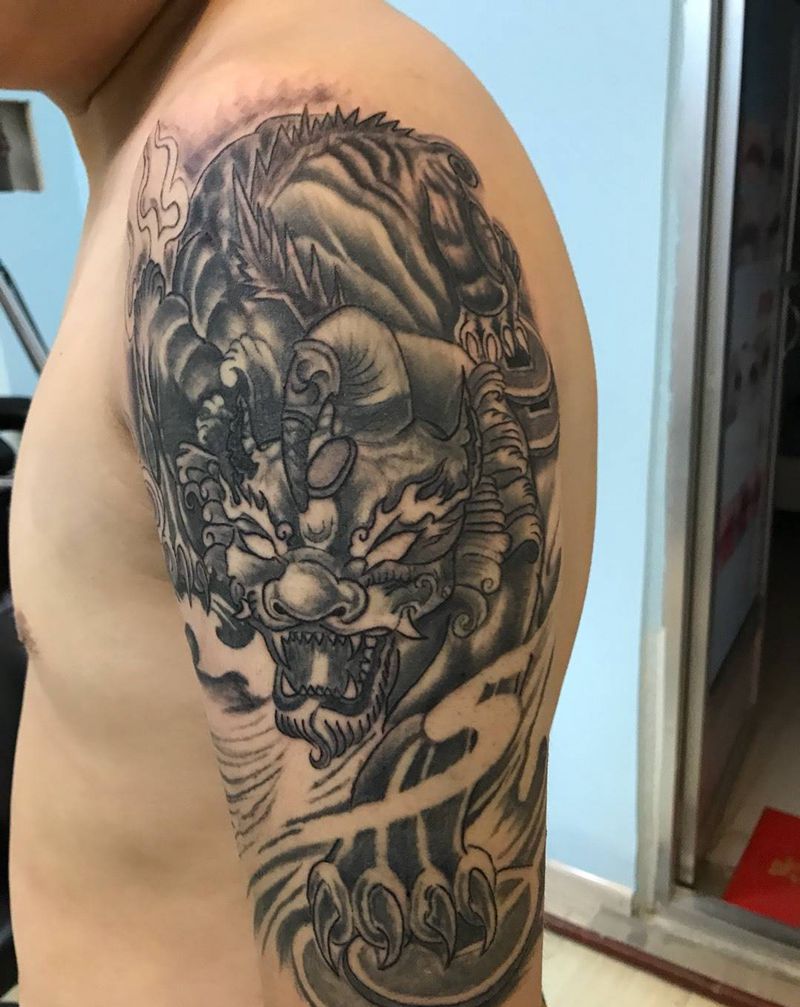 大臂貔貅遮盖纹身图片_成品手臂传统习俗鬼神动物纹身图案