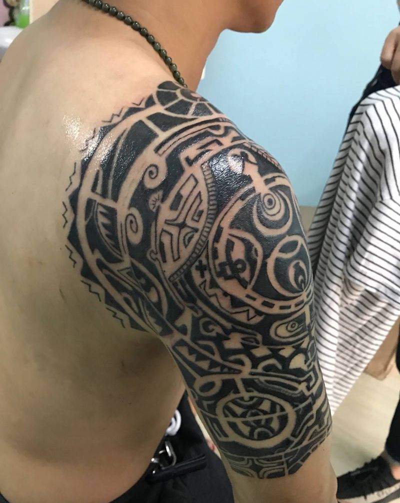 当前位置: 首页 >山东省东营市纹身店-铭源刺青·纹绣 TATTOO纹身图案>大臂图腾纹身图片_成品手臂肩部欧美写实图腾几何纹身图案