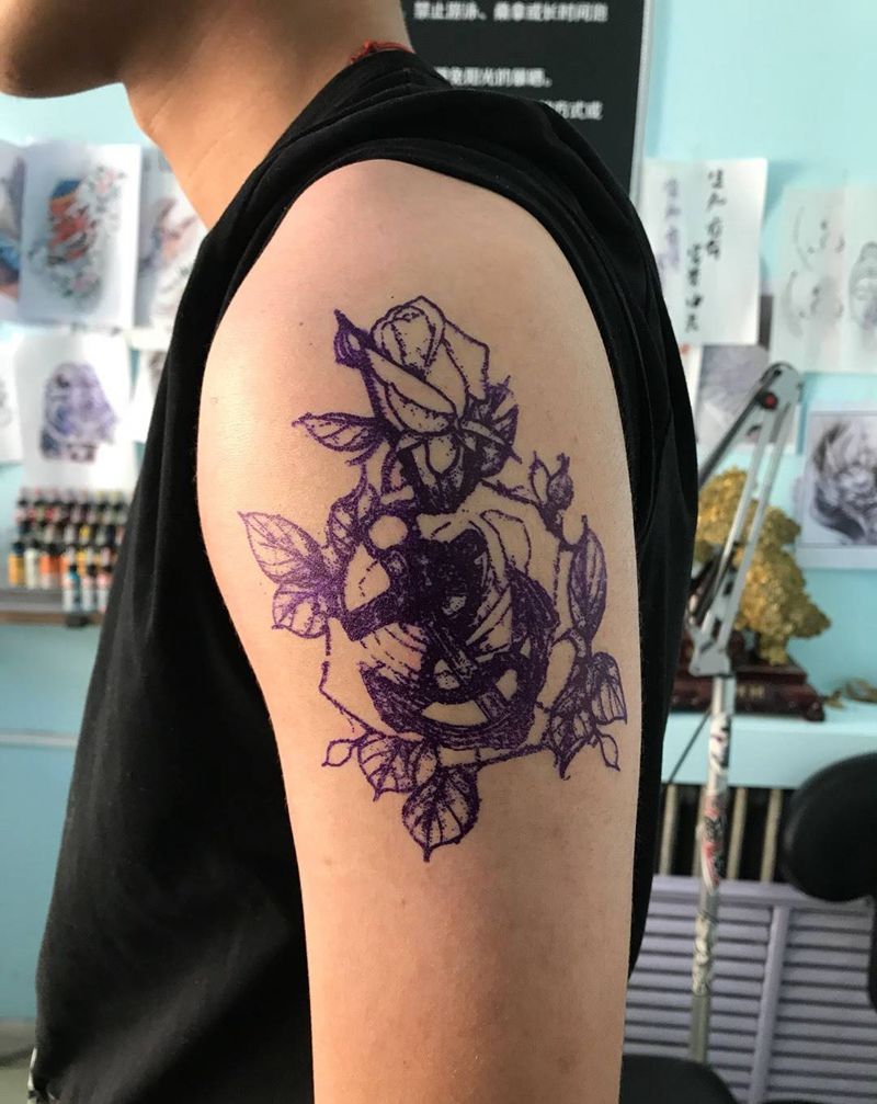 大臂船锚加玫瑰纹身图片_成品手臂欧美传统原创植物静物纹身图案
