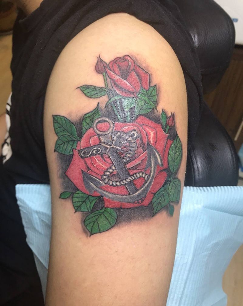 大臂船锚加玫瑰纹身图片_成品手臂欧美传统原创植物静物纹身图案