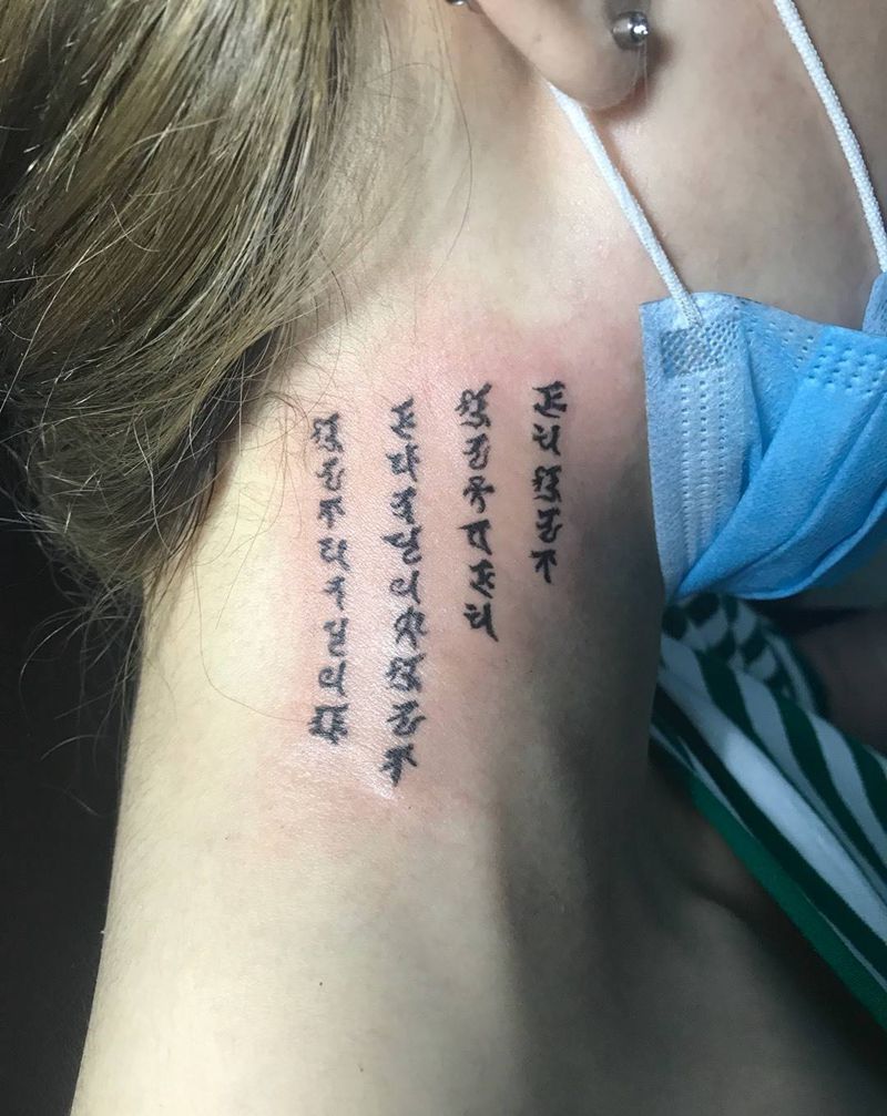 当前位置: 首页 >山东省东营市纹身店-铭源刺青·纹绣 TATTOO纹身图案>颈部梵文纹身图片_成品颈部传统习俗字符原创纹身图案