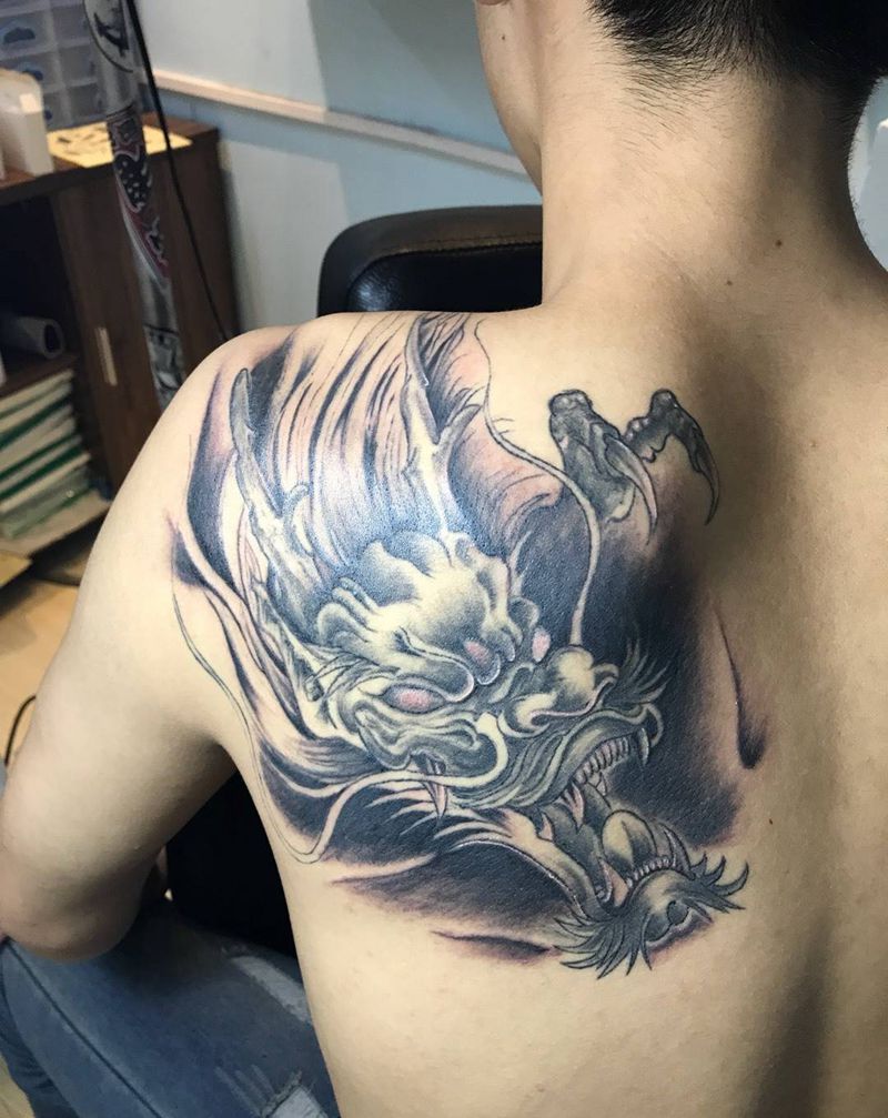 后肩龙头纹身图片_成品背部传统习俗动物鬼神纹身图案