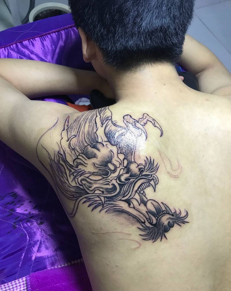 当前位置: 首页 >山东省东营市纹身店-铭源刺青·纹绣 TATTOO纹身图案>后肩龙头纹身图片_成品背部传统习俗动物鬼神纹身图案