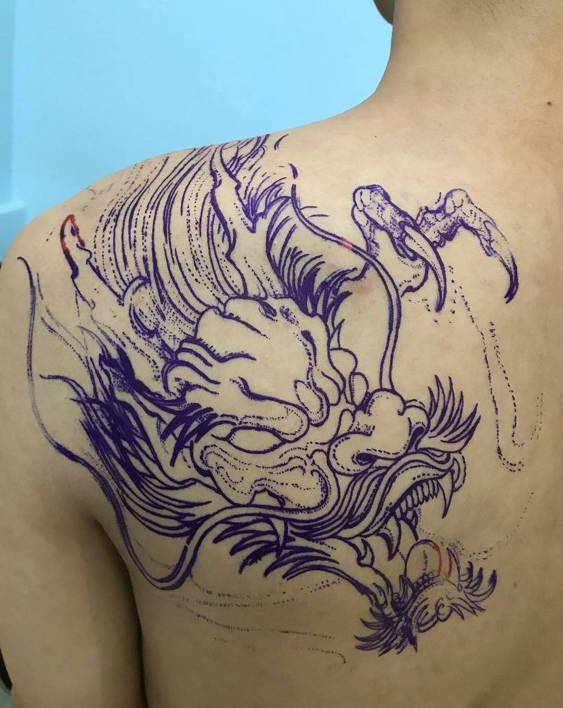 后肩龙头纹身图片_成品背部传统习俗动物鬼神纹身图案