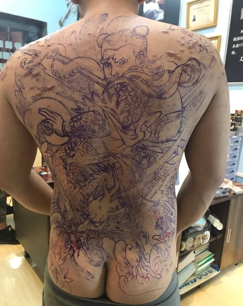 哪吒闹海(未完成)纹身图片_背部新传统点刺纹身图案