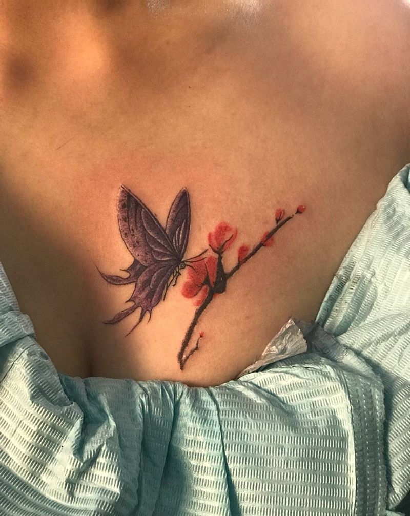 梅花蝴蝶纹身图片_胸部新传统纹身图案