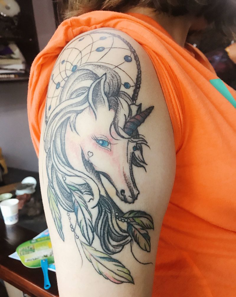 捕梦网+独角兽纹身图片_手臂水彩纹身图案
