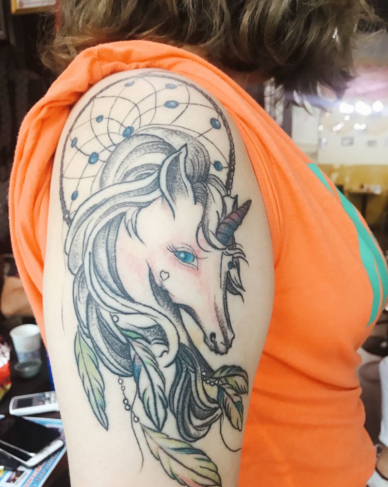 捕梦网+独角兽纹身图片_手臂水彩纹身图案