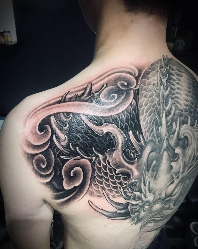 当前位置: 首页 >山东省烟台市纹身店-墨华刺青纹身图案>鲤鱼跃龙门纹身图片_背部新传统龙鱼纹身图案