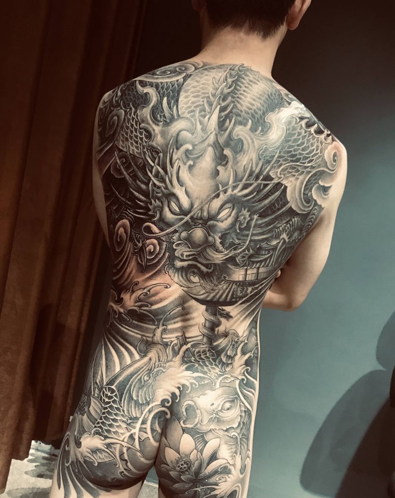 当前位置: 首页 >山东省烟台市纹身店-墨华刺青纹身图案>鲤鱼跃龙门纹身图片_背部新传统龙鱼纹身图案