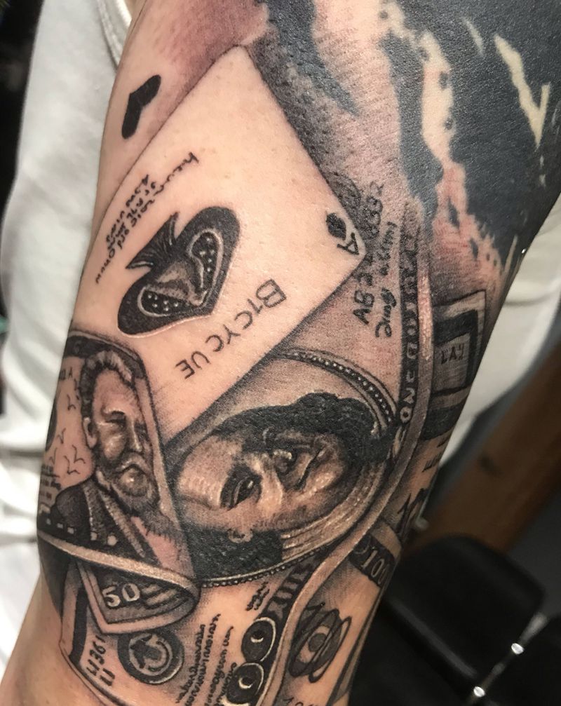当前位置: 首页 >山东省烟台市纹身店-墨华刺青纹身图案>美元纹身图片_手臂欧美写实美元扑克纹身图案