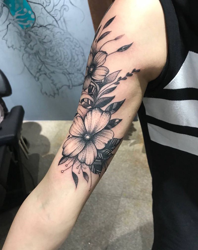 素花纹身图片_手臂点刺素花遮盖纹身图案