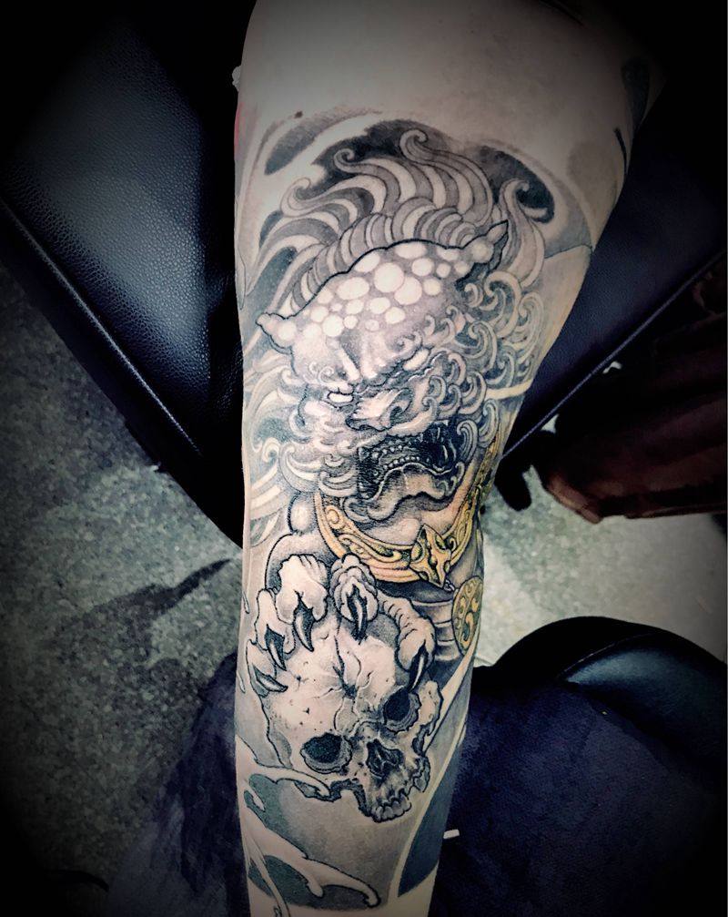 当前位置: 首页 >山东省烟台市纹身店-墨华刺青纹身图案>七分袖花臂纹身图片_手臂新传统点刺艺妓唐狮骷髅纹身图案