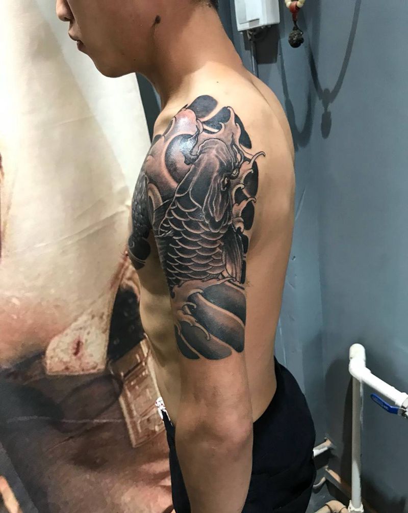 当前位置: 首页 >山东省烟台市纹身店-墨华刺青纹身图案>半胛佛头鲤鱼完成纹身图片