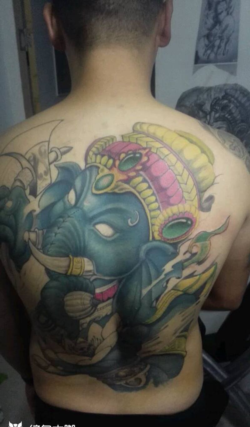 当前位置: 首页 >山东省烟台市纹身店-墨华刺青纹身图案>后背重彩象神纹身图片