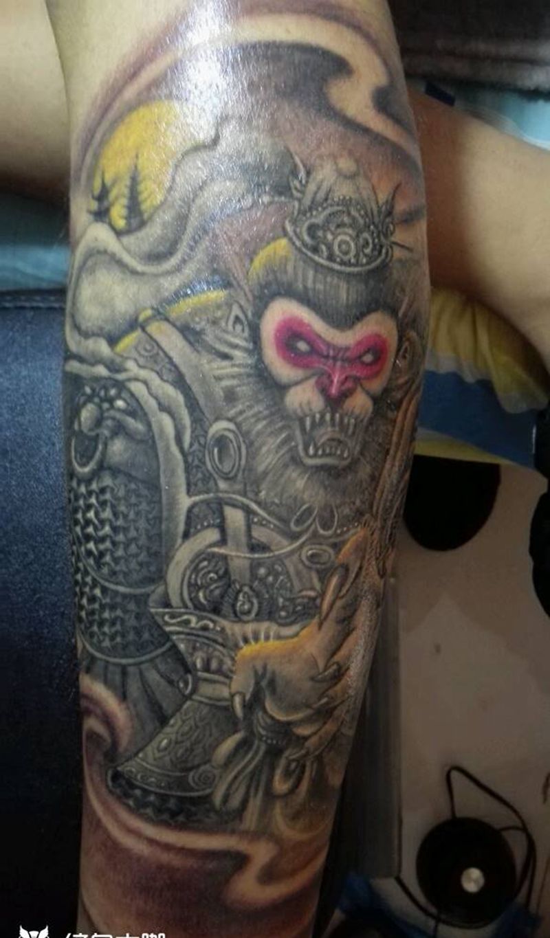 当前位置: 首页 >山东省烟台市纹身店-墨华刺青纹身图案>临摹种伟老师大圣完工纹身图片
