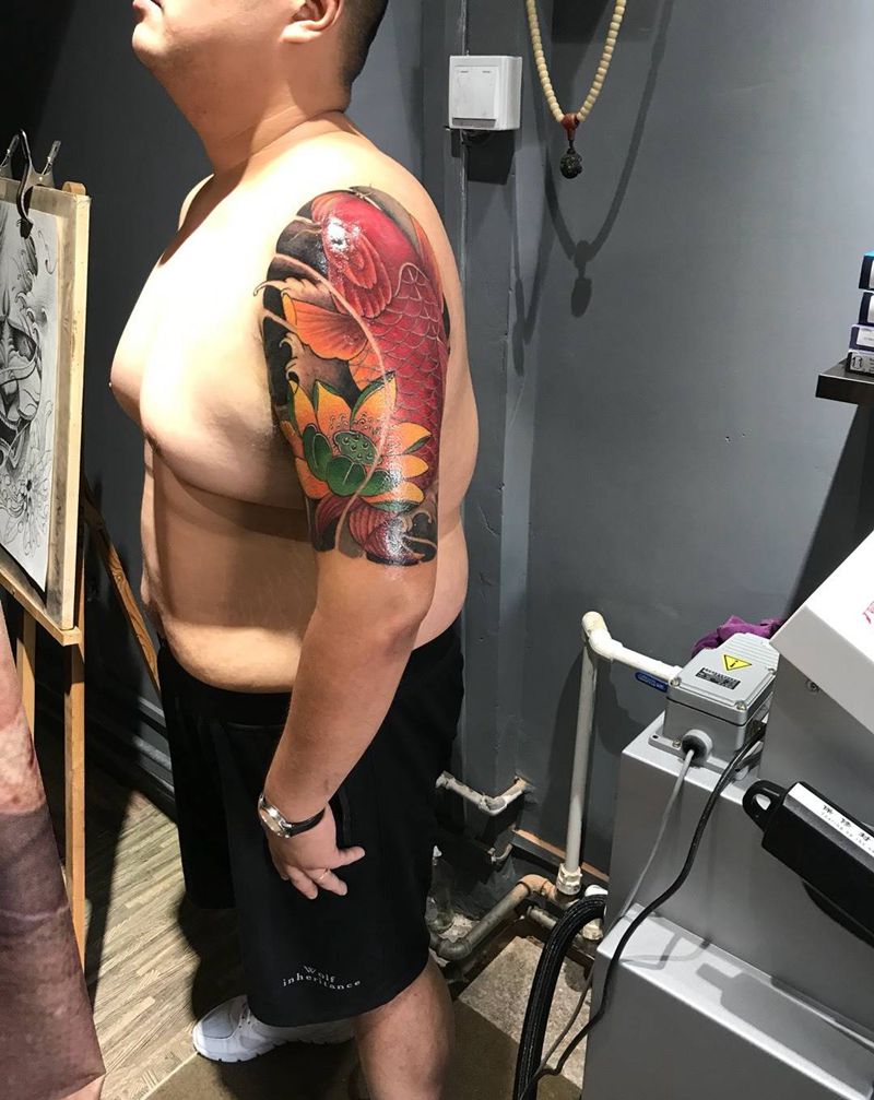 当前位置: 首页 >山东省烟台市纹身店-墨华刺青纹身图案>大臂彩色鲤鱼完成纹身图片