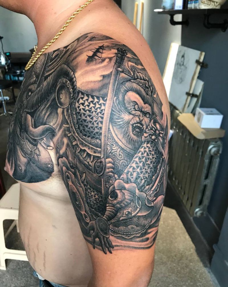 当前位置: 首页 >山东省烟台市纹身店-墨华刺青纹身图案>象神悟空半胛纹身图片