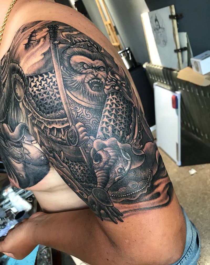 当前位置: 首页 >山东省烟台市纹身店-墨华刺青纹身图案>象神悟空半胛纹身图片