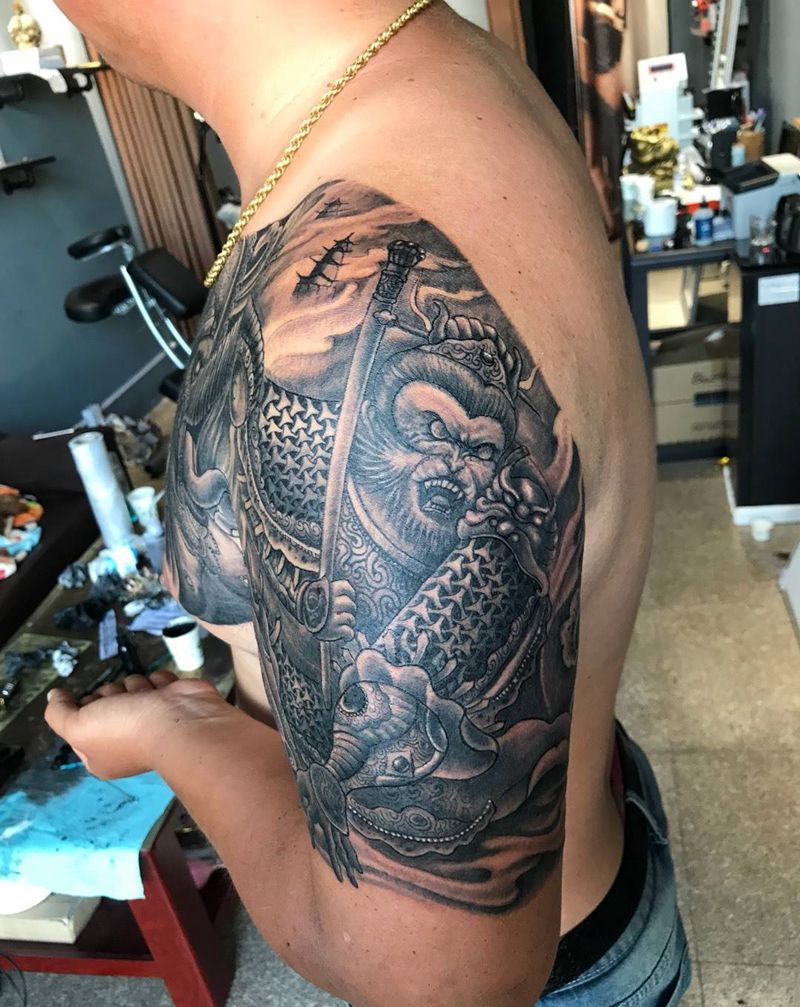 当前位置: 首页 >山东省烟台市纹身店-墨华刺青纹身图案>象神悟空半胛纹身图片