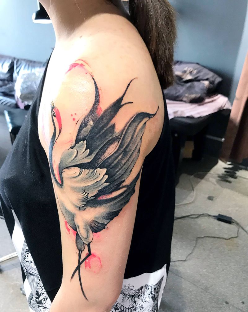 水墨仙鹤纹身图片_手臂水墨纹身图案