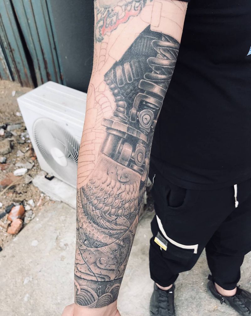 当前位置: 首页 >山东省烟台市纹身店-墨华刺青纹身图案>雕龙臂纹身图片_手臂欧美写实石雕机械纹身图案