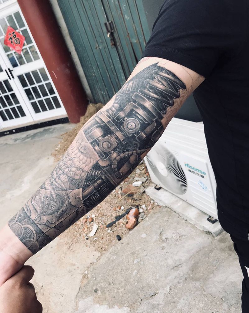 当前位置: 首页 >山东省烟台市纹身店-墨华刺青纹身图案>雕龙臂纹身图片_手臂欧美写实石雕机械纹身图案