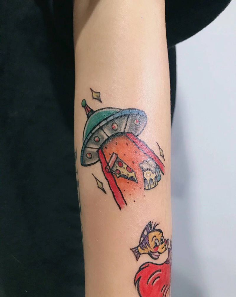 当前位置: 首页 >山东省东营市纹身店-彫卓刺青纹身图案>拼接花臂小图纹身图片_手臂Old School人物飞船纹身图案
