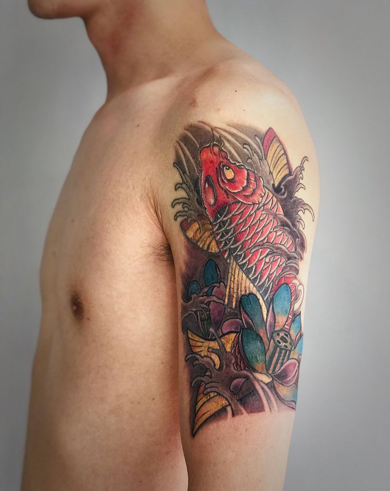 当前位置: 首页 >山东省东营市纹身店-彫卓刺青纹身图案>鲤鱼纹身图片_手臂新传统鲤鱼纹身图案