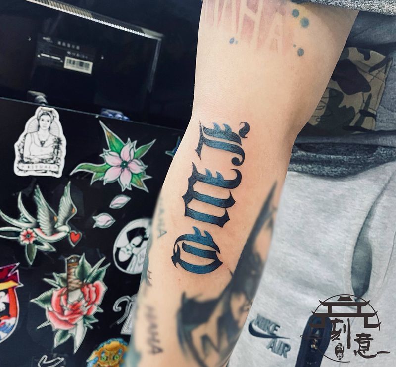 当前位置: 首页 >山东省烟台市纹身店-刻意刺青纹身图案>小花体字纹身图片_手臂花体字纹身图案