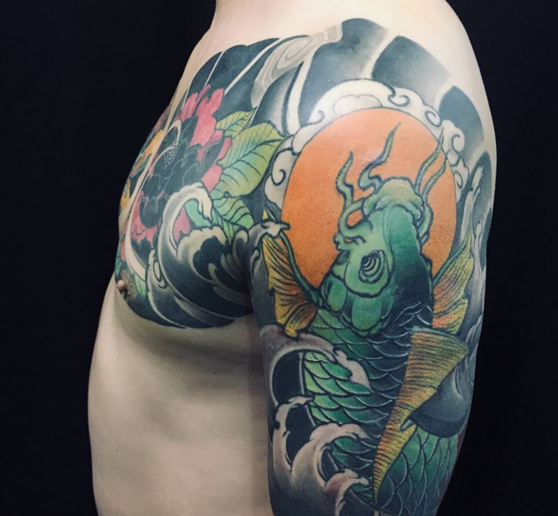 彩色双半甲(修改)纹身图片_胸部手臂新传统鱼荷花彩色纹身图案