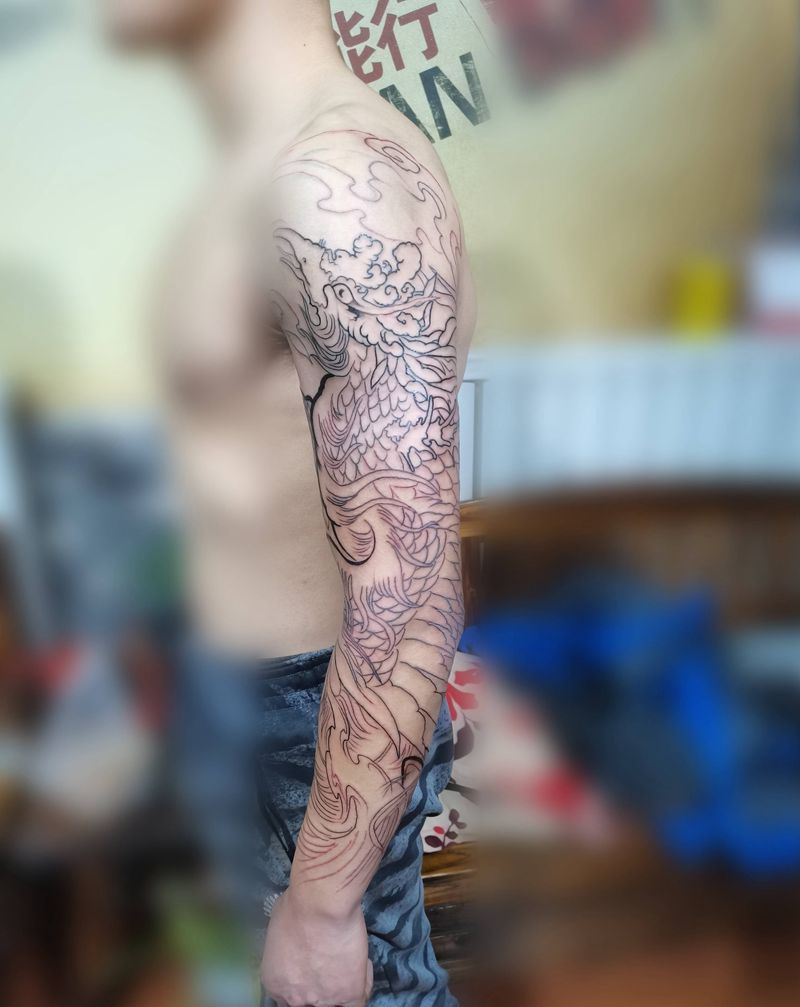 当前位置: 首页 >山东省潍坊市纹身店-忠義堂刺青纹身图案>花臂凤凰线条走起,纹身图片_手臂纹身图案