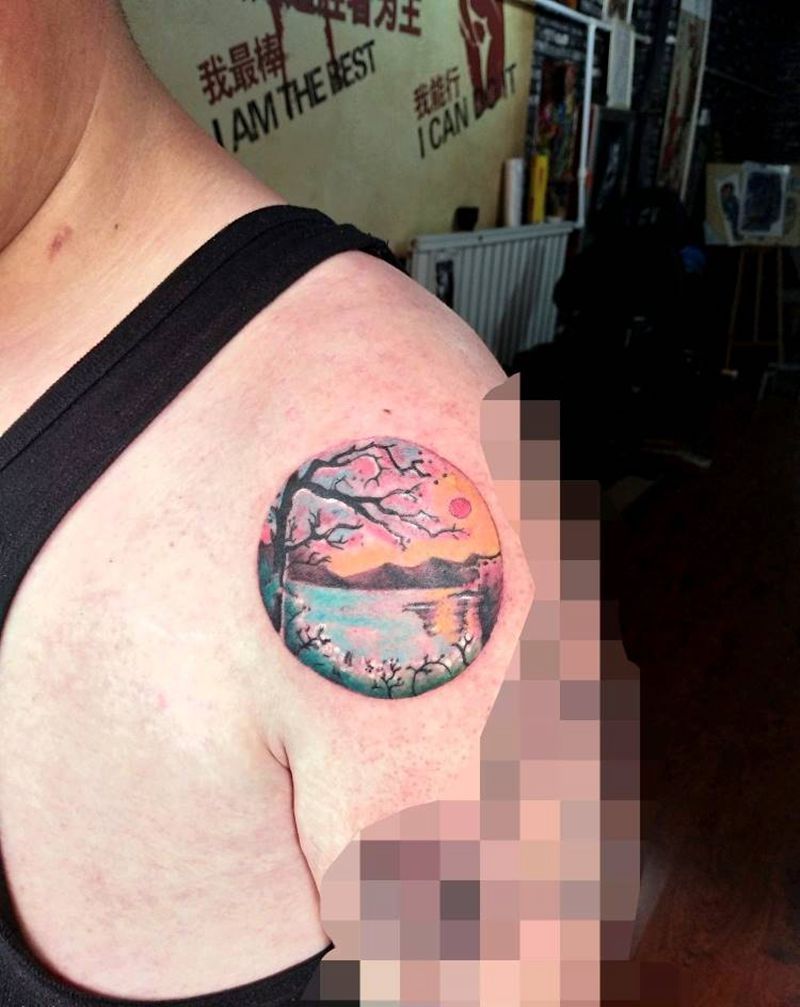 花前月下纹身图片_肩部写实植物纹身图案