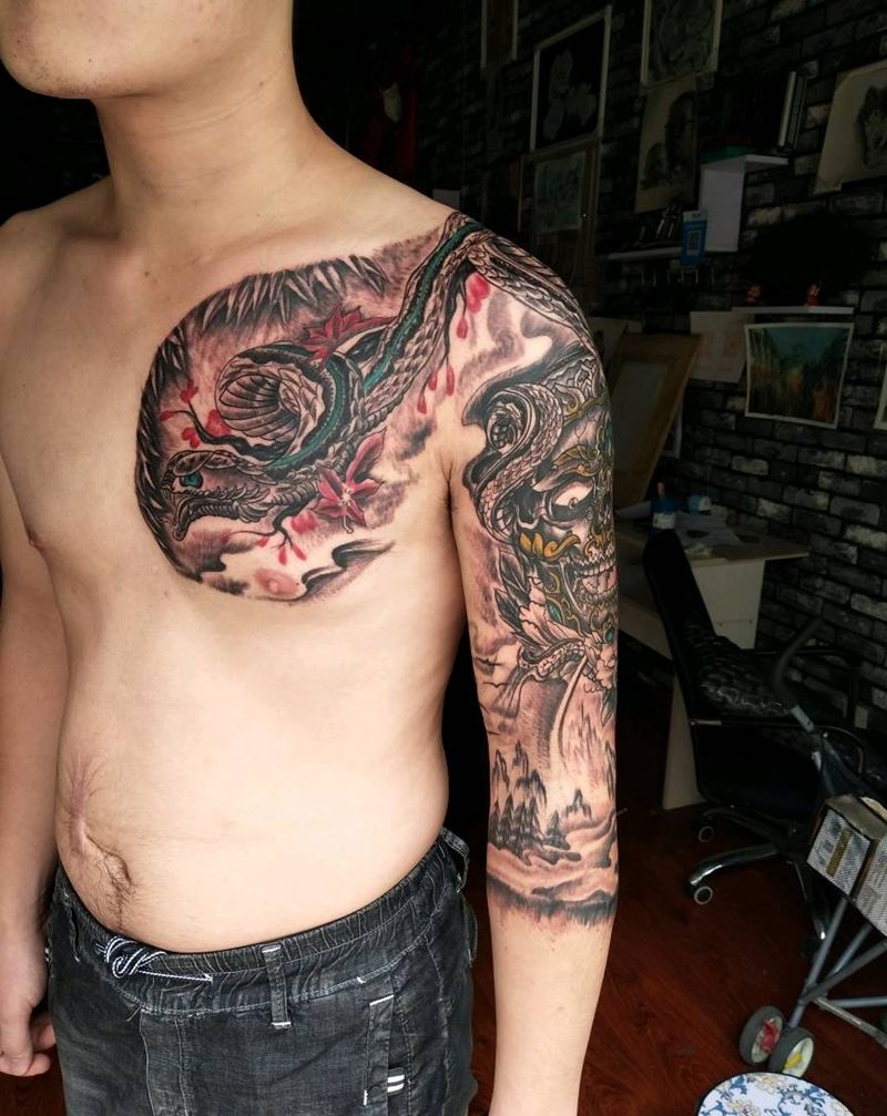 当前位置: 首页 >山东省潍坊市纹身店-忠義堂刺青纹身图案>主题蛇设计的七分袖纹身图片_胸部手臂传统动物植物纹身图案