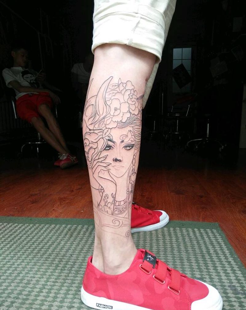 当前位置: 首页 >山东省潍坊市纹身店-忠義堂刺青纹身图案>小腿艺姬纹身图片