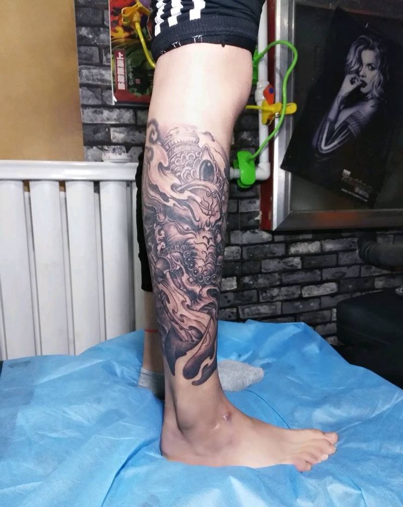 • T网红王老大花腿龙纹身图片_腿部新传统纹身图案
