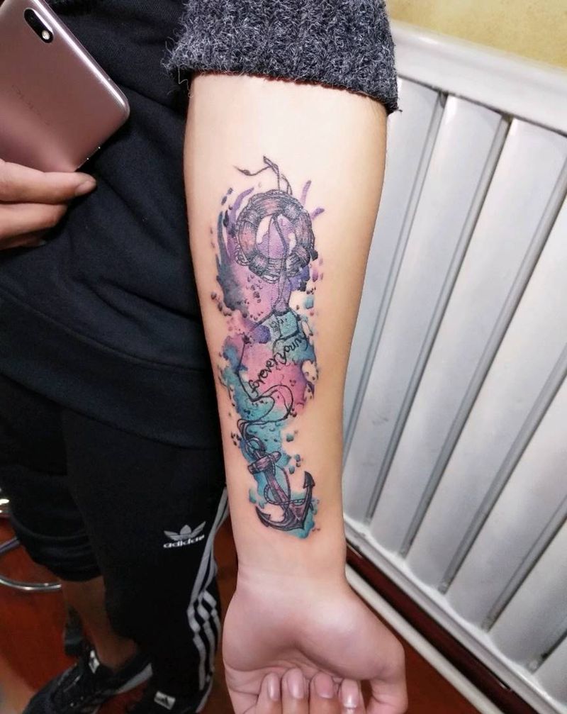 水彩船锚纹身图片_手臂清新静物成品纹身图案
