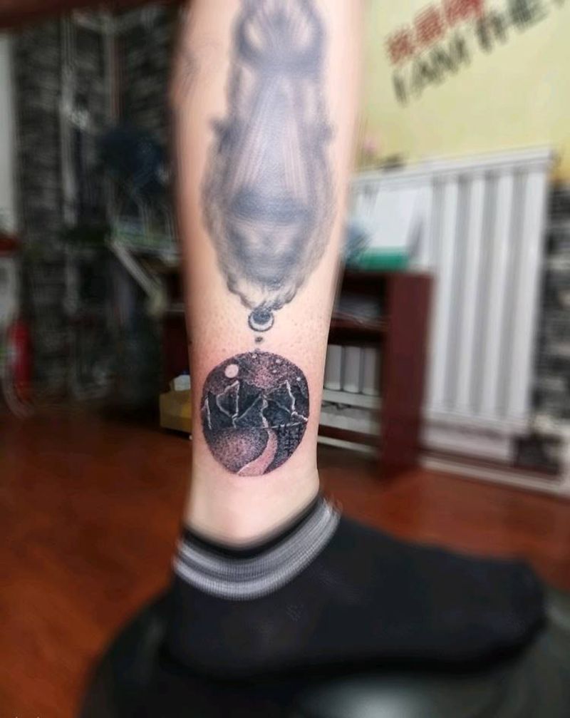 点刺远山风景,遮盖后纹身图片_腿部清新成品纹身图案
