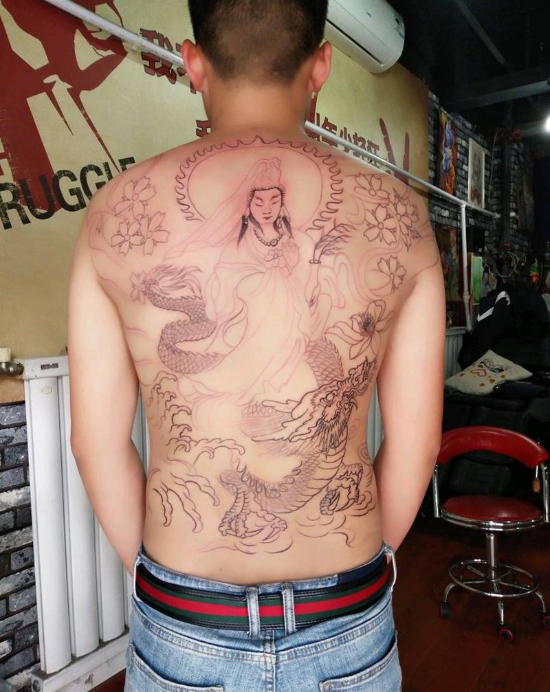 当前位置: 首页 >山东省潍坊市纹身店-忠義堂刺青纹身图案>线条观音踏龙纹身图片_背部传统人物纹身图案