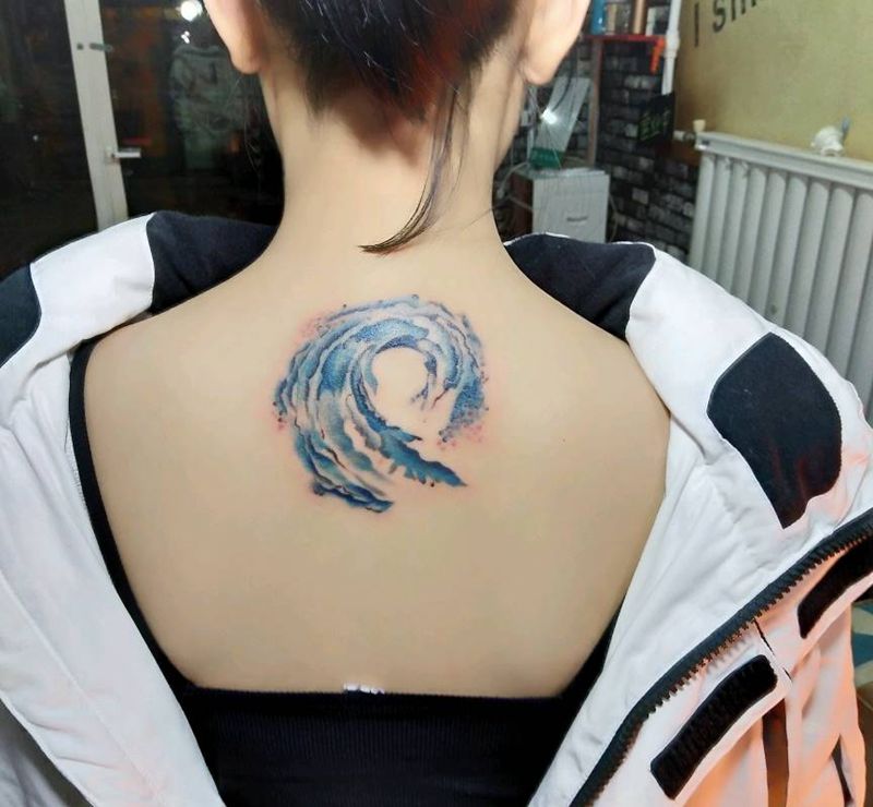 浪花朵朵纹身图片_背部水彩纹身图案