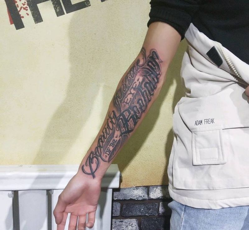 当前位置: 首页 >山东省潍坊市纹身店-忠義堂刺青纹身图案>卡奇诺花体纹身图片_手臂花体字纹身图案