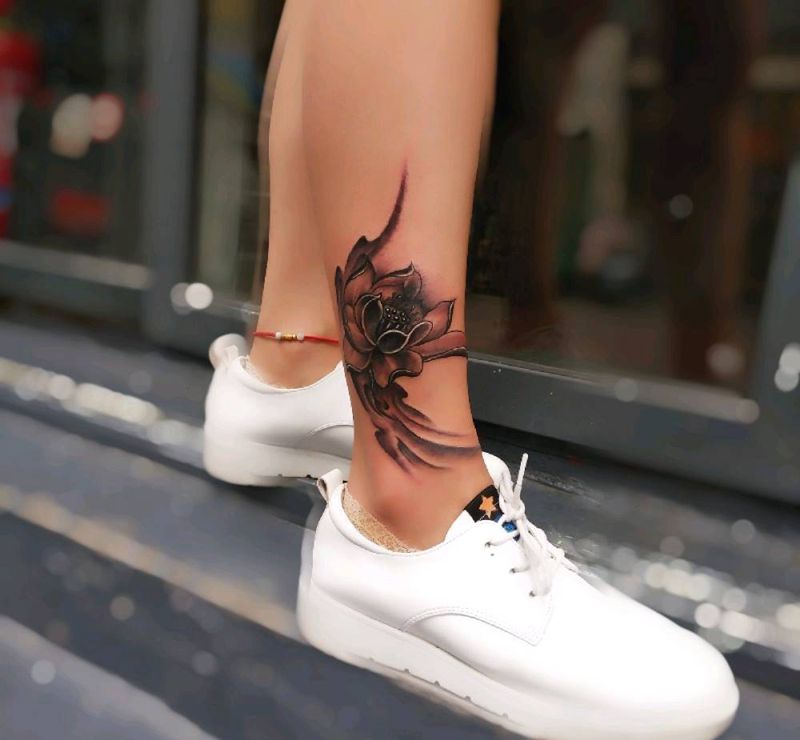 遮盖后荷花纹身图片_腿部新传统莲花纹身图案